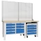 Модули верстака выполнены из холоднокатаной стали толщиной 0,8 мм. В верстаке возможна установка модулей шириной 480 мм и 680 мм. Имеется возможность установки вместо модуля полки-стенки либо использование подкатной тележки (мобильный модуль). Мобильный модуль имеет все четыре поворотные колесные опоры для более удобного маневрирования в небольших свободных пространствах.Возможна установка сверху модуля столешницы, аналогичной столешнице верстака, либо лотка. Максимальная масса груза распределённого по поверхности ящика до 40 кг, полки - до 60 кг. Модули оборудованы системой запирания.Регулировка по высоте