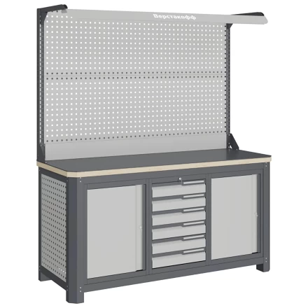 - экран (перфорированная панель) верстака выполнен с квадратной перфорацией 12х12 мм с шагом 38 мм для установки крючков, держателей и других аксессуаров;